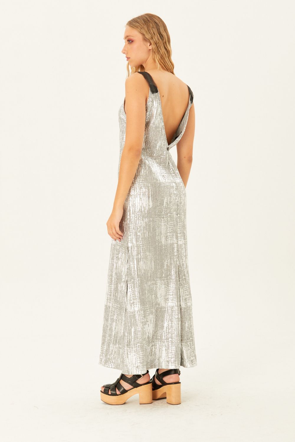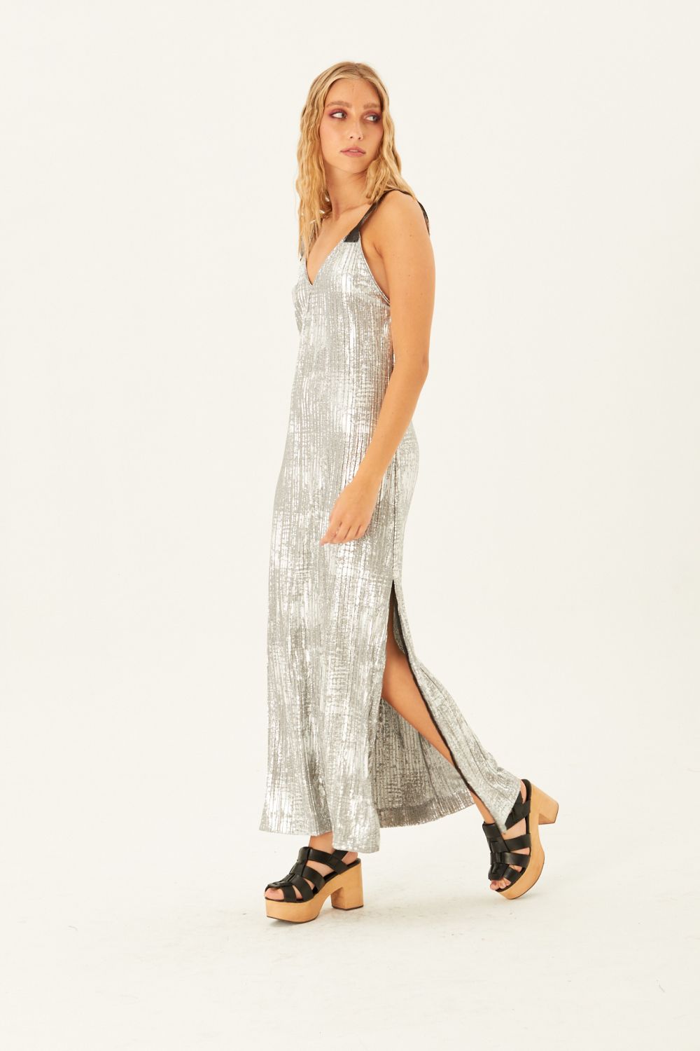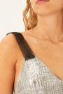 Vestido confeccionado en poliester con tiras de organza. Posee spandex y es semi plisado con foil.
